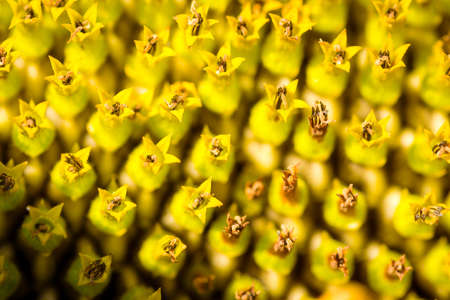 Macro shot of a vibrant sunflower, focusing on the intricate patterns of the seeds