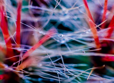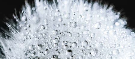 Beautiful dew drops on dandelion seed macro. soft background. Water drops on parachutes dandelion. Copy space. soft focus on water droplets. circular shape,