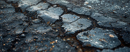 Closeup of a bad and cracked street. Asphalt texture with a rough surface grey background.