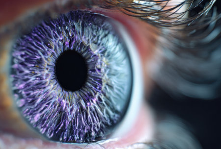 Detailed, close-up of a human eye with purple and blue iris, lashes and surrounding skin