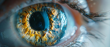Intricate details of a vibrant human eye, showcasing blue and yellow pigmentation with reflections on the cornea. fine eyelashes frame the eye, highlighting the texture and vivid coloration of the iris and the clarity of the gaze.