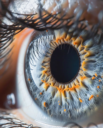 A close-up shot of a human eye, capturing intricate details of the iris with a stunning sunflower pattern. The image highlights the beauty and complexity of the human eye.