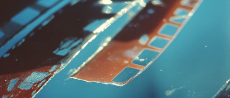 A film strip is placed under bright light, casting shadows and revealing details. The frames on the strip show varying sections, hinting at scenes captured on film.