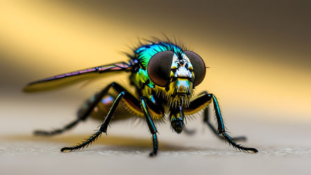 Macro close-up of a fly showing wings, fine hairs and iridescent shimmer on a blurred background. Generative AI.