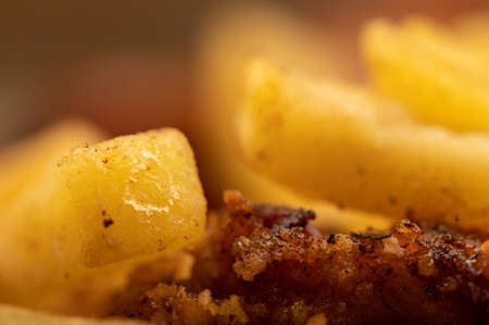 Fried chicken wings and French fries on a plate, close-up, selective focus