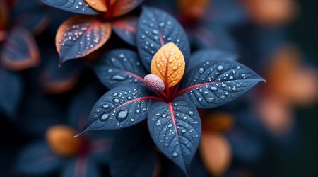 A beautiful close up of a plant with dark teal and red leaves covered in glistening water droplets. The background is softly blurred creating a moody and magical atmosphere.
