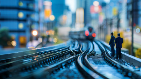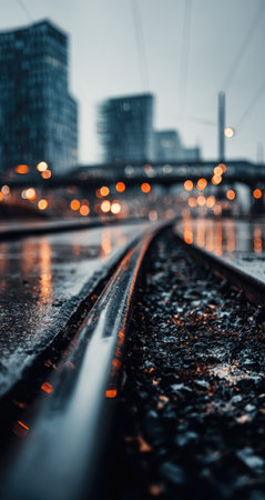 Close-up of railroad tracks glistens in the rain, extending towards a blurred cityscape. The image showcases the wet asphalt, reflecting the ambient streetlights. The composition features a shallow depth of field, emphasizing the texture of the tracks. Suitable for editorial purposes and various commercial applications.