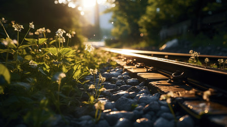 Close-up of train tracks, symbolizing journey and exploration. AI generative.