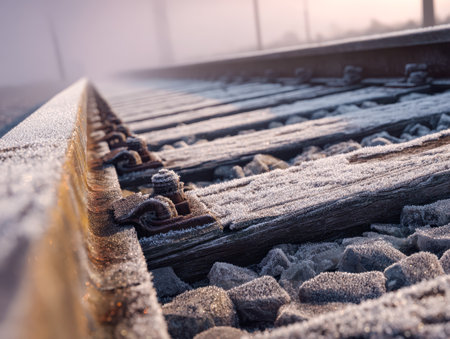 Snow and ice blanket the railway lines amid a quiet winter scene, with frosty trees and a soft, muted sky creating a serene, chilly atmosphere.