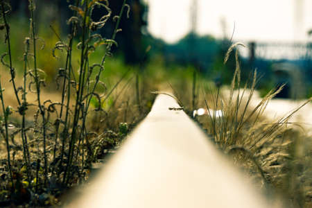 Close up rail brackets or fasteners. Vintage color concept, Railway track