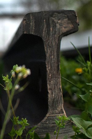 Green plant grows from under the stones Near railway tracks close-up, macro. Copy space. Concept life.