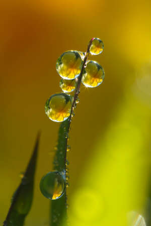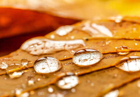Dew drops on yellow leaves close-up