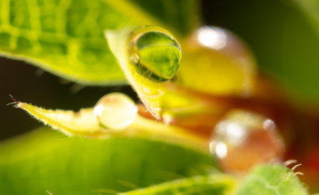 Closeup of waterdrops rolling on green leaves in the garden after rain