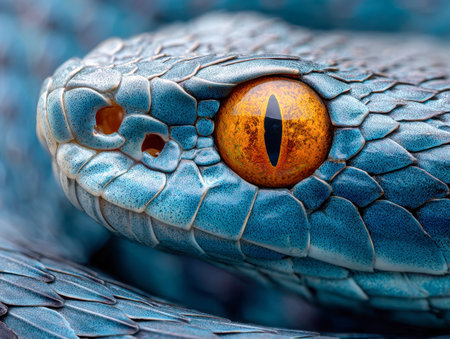 A striking close-up revealing the intense orange iris and rugged sapphire scales, capturing the exquisite detail and mesmerizing patterns of serpent skin.