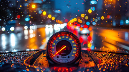 Close-up of car speedometer with neon red details amidst raindrops. That the image is generated using AI.