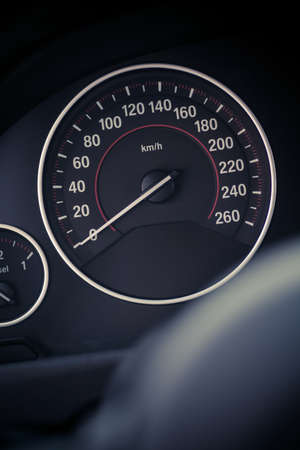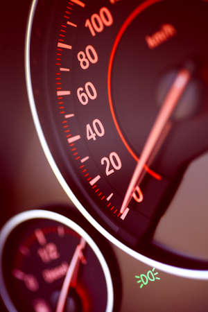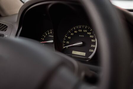 Close up shot of a speedometer in a car. Car dashboard. Dashboard details with indication lamps.Car instrument panel. Dashboard with speedometer, tachometer, odometer. Car detailing. Modern interior