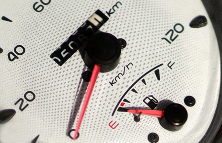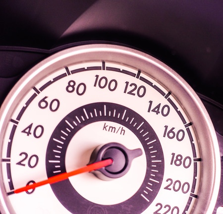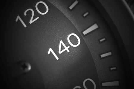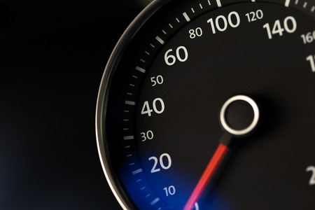 Closeup of a speedometer in a car dashboard, measuring vehicle speed