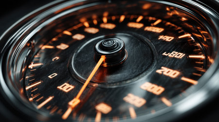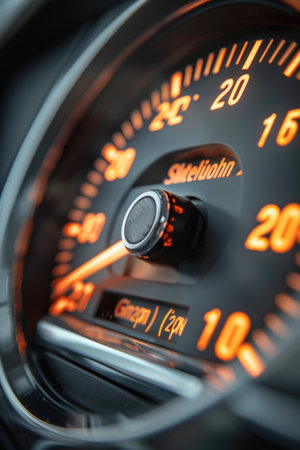 Close-up of glowing speedometer dial with illuminated orange and blue details. That the image is generated using AI.