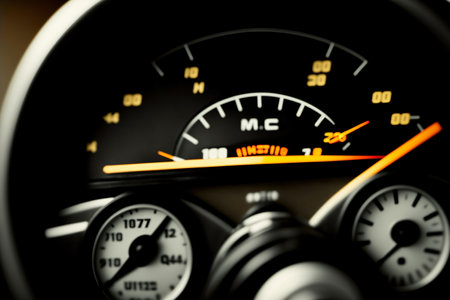 Close-up of illuminated speedometer display with red and white indicators. That the image is generated using AI.