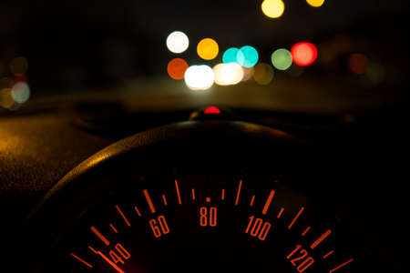 Car dashboard with glowing orange rings illuminates the speedometer and other gauges, indicating speed and vehicle status during night driving conditions
