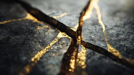 This image features a detailed close-up of a cracked stone surface featuring shimmering gold veins that highlight the unique textures and patterns of the rock.