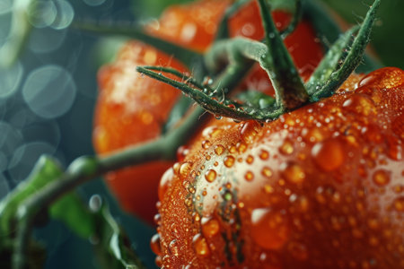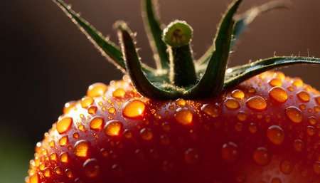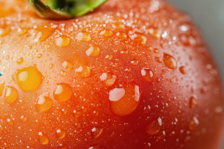 A macro shot capturing the delicate balance of water droplets on the surface of a ripe tomato, a symbol of nature's perfection