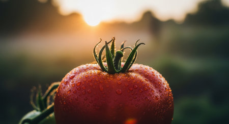 Ripe red tomato covered in fresh morning dew drops, captured in a close up with soft golden light in the background.
