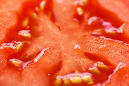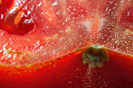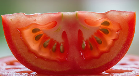Fresh red tomato slice, macro view, showcasing its juicy flesh, translucent skin, and visible seeds. ideal for healthy food, cooking, and fresh ingredient concepts.