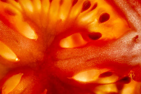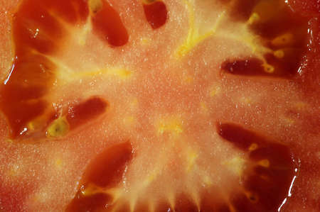 An extreme macro shot of a freshly sliced red tomato, revealing its juicy interior. The image shows the vibrant red pulp, the yellow seeds in their gelatinous sacs, and the central core. This texture represents freshness, health, and vegetables.