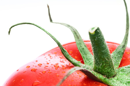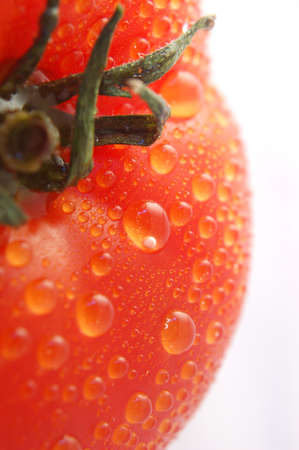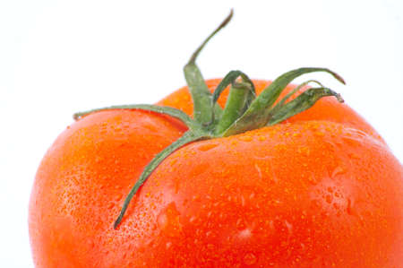 A close-up of a fresh tomato with a dewy surface, emphasizing its ripe, red color and juicy texture against a clean, white background.