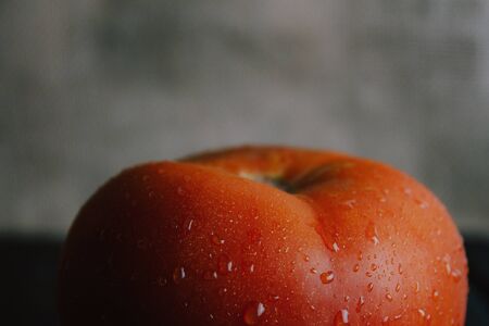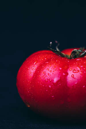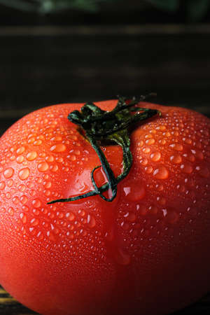 Fresh tomato with water drops on dark background. Shallow DOF.