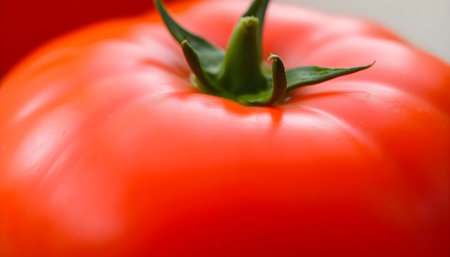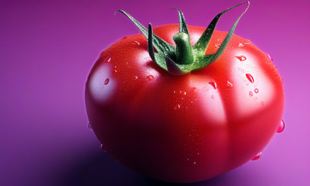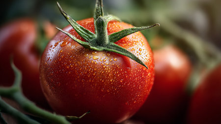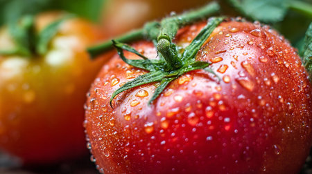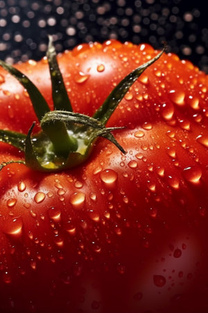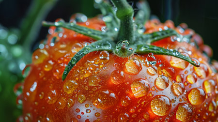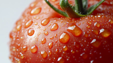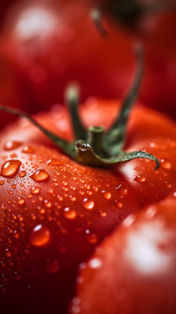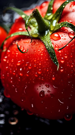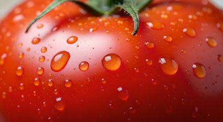 Macro shot of a ripe red tomato covered with water droplets, showcasing its freshness and vibrant color. Ideal for food, health, and culinary related content.