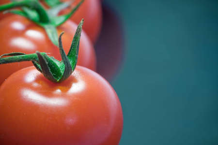 Vertical image of fresh ripe red tomato on blue background. fresh and organic vegetable produce.