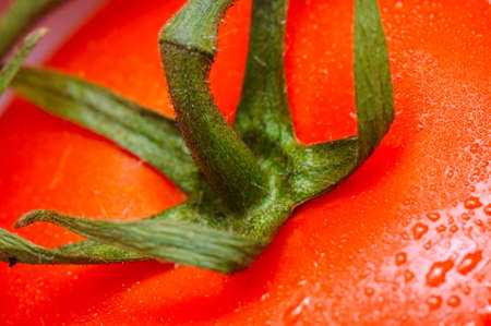 A ripe tomato with water droplets on its surface and a green stem, in a close-up view
