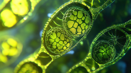 A scientific view of plant cells under a microscope, showcasing chloroplasts and the process of photosynthesis in a detailed abstract.