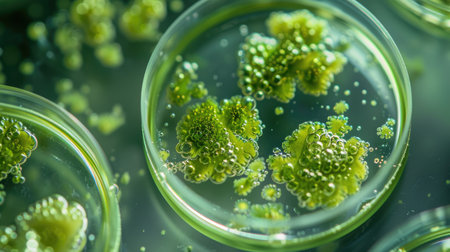 Clusters of green microalgae are observed in Petri dishes in a lab environment, shimmering with water droplets.