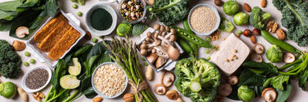 Vegan food panorama, overhead flat lay shot of various superfoods