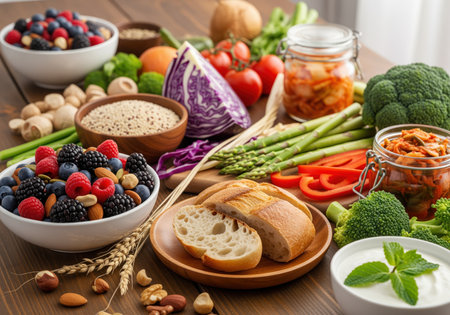 A comprehensive assortment of fresh raw vegetables, mixed berries, nuts, grains, bread, and fermented kimchi and yogurt, representing a balanced diet rich in prebiotic and probiotic elements.