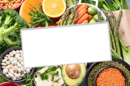 Healthy balanced dieting concept. Selection of rich fiber sources vegan food. Vegetables fruit seeds beans ingredients for cooking