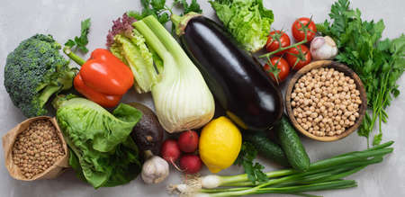 Assorted vegetables and cereal on gray background. Healthy food concept. Top view