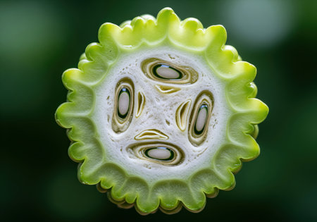 Extreme close up of a freshly cut bitter melon slice highlighting the jagged green exterior and the seeds embedded in the white flesh.