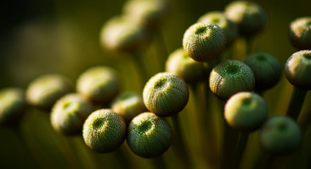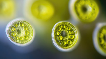 Captivating close-up of green algae cells displaying intricate bubble-like structures, showcasing the beauty of microscopic life in a vibrant natural setting.