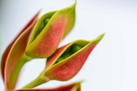 Explore the intricate beauty of exotic flower buds and lush green leaves in this close-up image, highlighting nature's stunning textures and patterns.