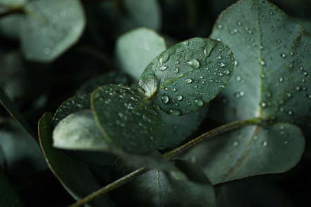 Branch of eucalyptus on dark green background, gloomy photo of the plant