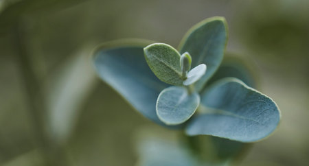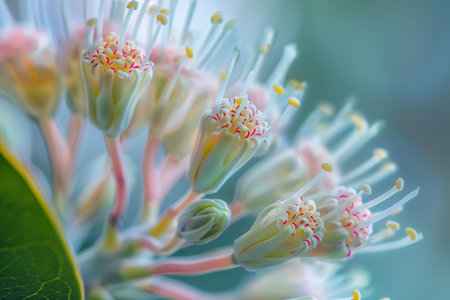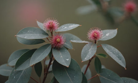 close-up of eucalyptus flower with dew drops on the petals, created with generative ai