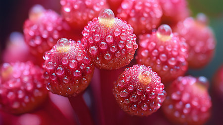 A macro shot captures the intricate beauty of pink flower buds adorned with glistening water droplets, creating a mesmerizing display of nature's artistry.