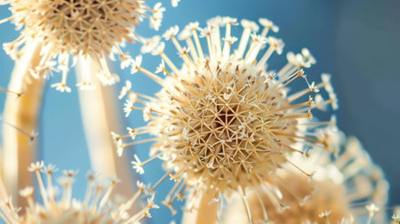 A close-up view of a dried flower head with white seeds. The seeds are arranged in a circular pattern around the center of the flower. The flower is surrounded by a blue background, creating a beautiful contrast between the delicate white seeds and the bright blue sky. The texture of the flower head and the intricate details of the seeds are visible.
