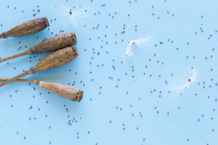 Beautiful flat background with dried wild poppy's flower, poppy's seeds, fluffs on soft blue background