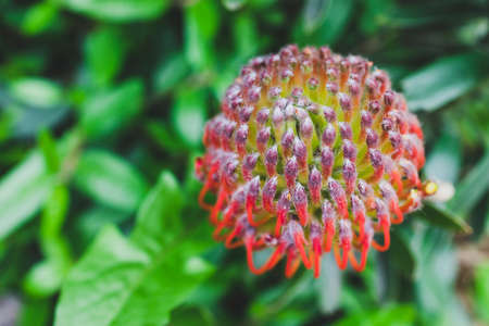 native Australian protea plant with round red flowers in bloom shot at shallow depth of field