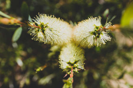 native Australian yellow callistemon plant outdoor in beautiful tropical backyard shot at shallow depth of field